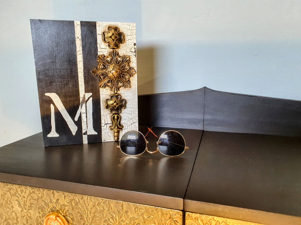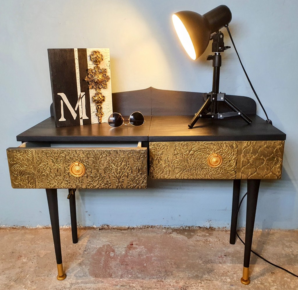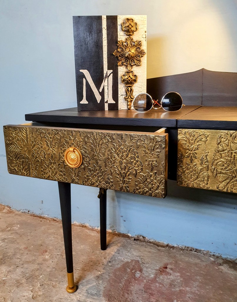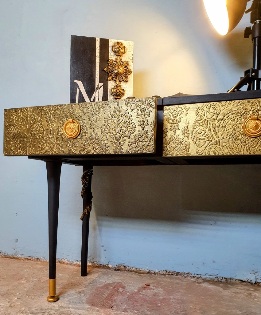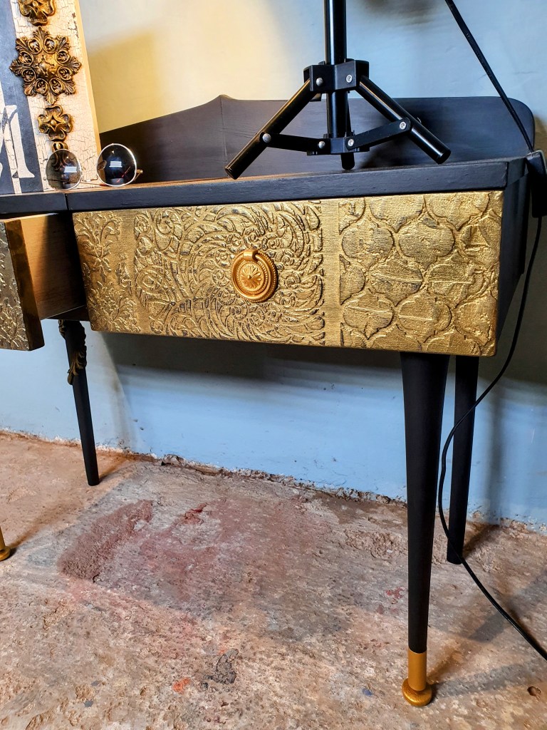 raised stenciling was applied on both drawers. Once sanded all the piece was given a couple of coats of Loof from the Frenchic paints. Finally some Gorgeous Gold Frensheen on the drawers, knobs and legs.